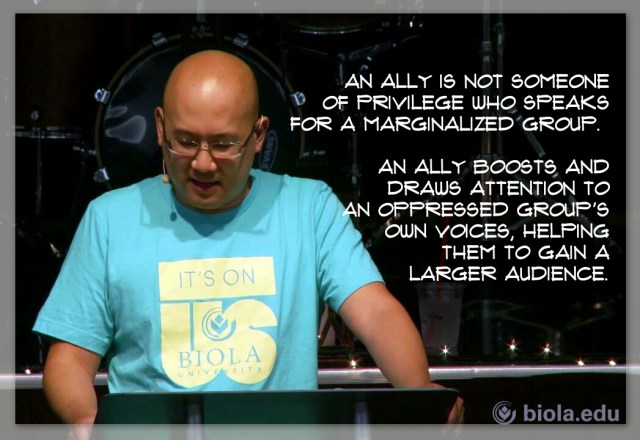In fact, an ally is not defined as someone of privilege who speaks for a marginalized group. Rather, being an ally means boosting and drawing attention to an oppressed group’s own voices, helping them to gain as large of an audience as possible.